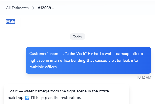 If you try to create an estimate, the chat is going to look empty after submitting. Tap on the tab “Main” at the top to begin the water damage. We’re fixing this and it should be resolved within about 48 hours of this post or sooner.